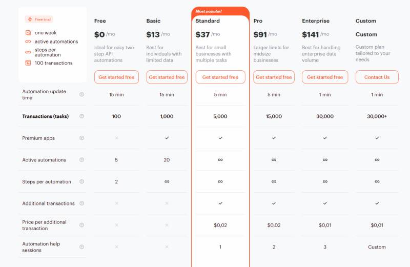 - Standard: $37/month – 5,000 transactions, unlimited automations, 5-minute update frequency.